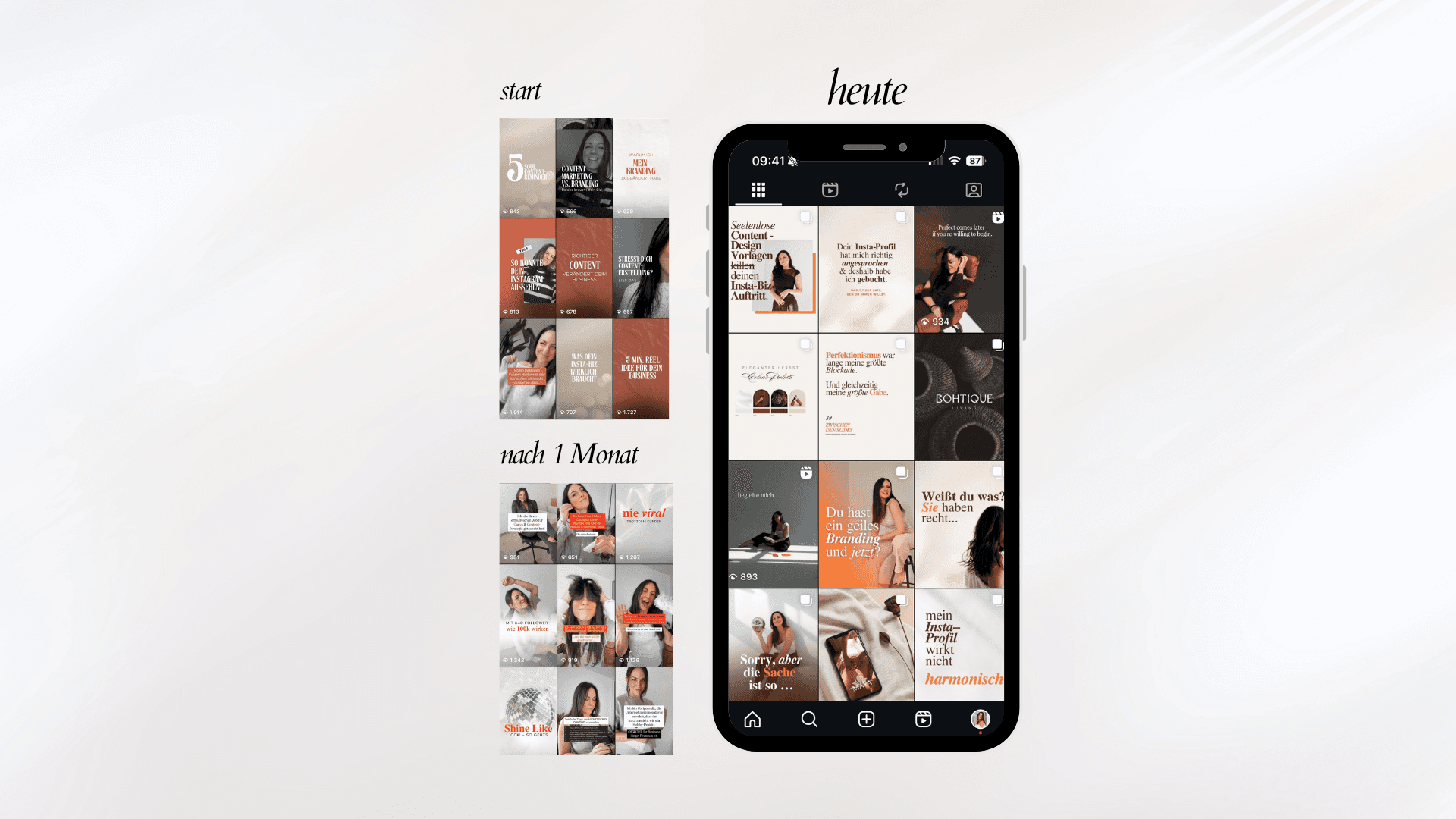 Deutschlandweit eines der ersten Coachings mit zusätzlichem Branding von Beginn an: visuelle Identität, Logo, Farben, Typo, Social-Vorlagen, bei Bedarf Website – ästhetisch und verkaufspsychologisch erstellt..